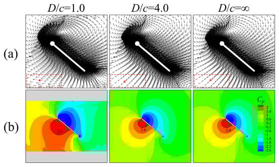 To explain why there is larger positive pressure on the lower wing surface for the combined ceiling and ground case, the velocity vectors in the inertial frame around the wing section, plus the pressure contours, are plotted in Figure 11. It is found that due to the restriction of the ground at = 1.0, a narrow channel is formed between the trailing edge of the wing and the ground, and the velocity vectors are ‘squeezed’ to align more horizontally than that at = 4.0 and = ∞. This leads to a larger pressure on the lower surface in Figure 8, which is also evident in the pressure contour distribution and the high-pressure area encircled by the single contour line with a value of 2.0 in Figure 11b. As the clearance increases to = 4.0, the air squeezing effect is very weak, the vectors are almost the same between the = 4.0 and ∞, and finally, the pressure distributions of these two cases are almost the same.