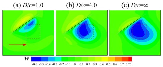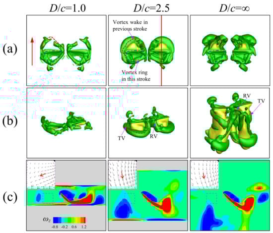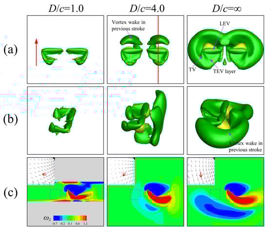 At = 4.0, due to the existence of the ceiling and ground, the vortex wake of the previous stroke dissipates quickly. This can be seen by comparing the size of the iso-Q surface of the vortex wake of = 4.0 with that of = ∞ in Figure 13a. Consequently, the downwash caused by the vortex wake is lower near the wing’s head. At = 1.0, the vortex wake from the preceding stroke already disappears, so that the downwash is negligible.