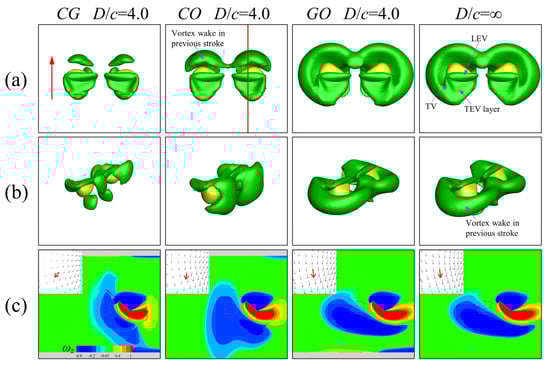 Figure 14a,b exhibit different views of the vortex structures (iso-Q surfaces—green), and the downwash (iso-vertical velocity surface—yellow) at mid-downstroke ( = 0.25). It includes the combined ceiling and ground case (referred to as ), the ceiling-only case (referred to as ) and the ground-only case (referred to as ) at = 4.0 and infinity case ( = ∞ case). Observing Figure 14a,b, the vortex structures are almost the same for the ground-only case at = 4.0 and the infinity case. There is an accumulated and stable vortex wake ahead of the flapping wing as marked in Figure 14b, which causes the largest downwash strength. This similar vortex wake, plus the similar aerodynamic forces in Figure 6 and Table 1, indicates that the ground-only effect disappears at = 4.0 or larger. However, for the ceiling-only case at = 4.0, the vortex wake left by the last flapping cycle is reduced in size and is much more scattered and weaker, resulting in a weaker downwash. Hence, the forces of the flapping wing are increased for the ceiling-only case at this wall clearance, as shown in Figure 6 and Table 1. In the case of the combined ceiling and ground, the vortex wake of the preceding stroke is further reduced in size, and is the weakest among the four cases, resulting in the weakest downwash.