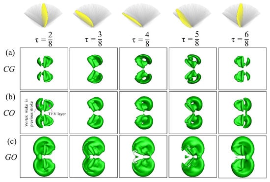 Top view of the iso-Q surface (green) with vortex wake for (a) the combined ceiling and ground case (referred to as ); (b) the ceiling-only case (referred to as ); and (c) the ground-only case (referred to as ) at = 4.0 for different times at . The non-transparent wing in the first row indicates the position of the wing at the corresponding time.