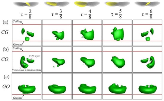To explore how this coupling effect on the vortex wake happens, Figure 15 and Figure 16 plot the evolution of the vortex wake over time from mid-downstroke ( = 2/8) to the successive mid-upstroke ( = 6/8) for three cases above at = 4.0 (also referred to as , and ). Again, the bigger of the volume of the iso-Q surface, the stronger the vortex wake. Based on the findings of Ref. [43], a vortex ring needs energy input to keep its form and intensity. The self-induced downwash associated with the vortex ring of the flapping wing can also be regarded as the energy source. The fluid’s viscosity and the no-slip boundary on the ceiling could decrease the self-induced downwash above and within the TEV layer. Thus, the input energy of the vortex ring is reduced. Considering that the ground-only effect disappears at = 4.0, it is reasonable that the vortex wake of the ceiling-only case would dissipate more rapidly than that of the ground-only case. This can be seen in the top view of the time evolution of the vortex structure in Figure 15b,c. In addition, it shows that the dissipation of the vortex wake for the combined ceiling and ground case is faster than that of the ceiling-only case.