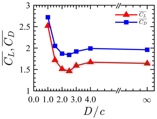Cycled-averaged lift () and drag () coefficients versus wall clearance () at .