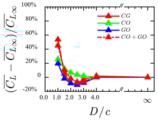 The relative increment of cycled-averaged lift coefficient relative to the = ∞ case (expressed as ) at . , , and represent the combined ceiling and ground case, the sum of the ceiling-only case and the ground-only case, the ceiling-only case, and the ground-only case, respectively.