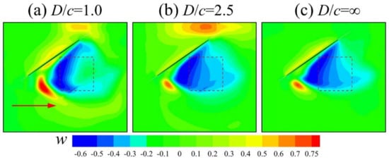 To explain the reasons for the non-monotonous aerodynamic force behavior for the combined ceiling and ground case at = 100, the vortex structures and downwash were also studied. Figure 20 shows the downwash contours when the wing moves from left to right in the top view at = 1.0, = 2.5 and ∞. It is seen that the downwash strength firstly increases as the wall clearance () changes from 1.0 to 2.5, and then decreases as the wall clearance changes from 2.5 to ∞. When the wing flaps through this downwash region, a smaller downwash enlarges the effective angle of attack, and leads to larger forces. Moreover, the non-monotonous downwash strength causes the non-monotonous aerodynamic force behavior.