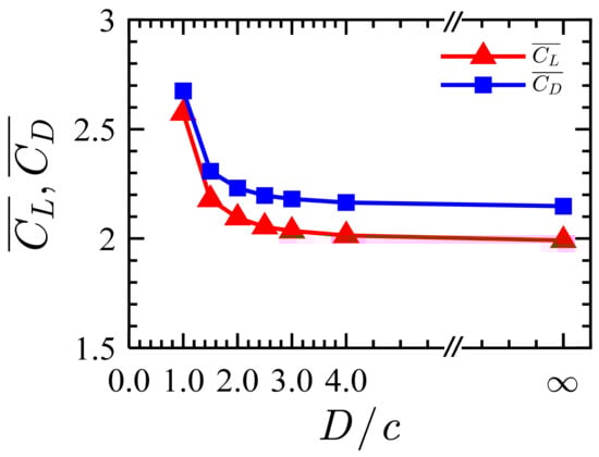 From previous ground-only effect studies, it is known that the force trends are different between = 10 and = 100 or higher, and the underlying fluid mechanisms are also different due to the different viscosity effects. Therefore, the combined ceiling and ground effect on aerodynamic forces were first investigated at a very low Reynolds number ( = 10). In the simulations, the combined ceiling and ground effect were examined at = 1.0, 1.5, 2.0, 2.5, 3.0, 4.0 and ∞.