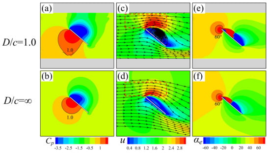 The pressure () distributions (a,b), the streamlines and velocity () contours relative to the wing (c,d), and the effective angle of attack () contours (e,f) at the first mid-downstroke () and . The first row is for = 1.0, and the second row is for = ∞.