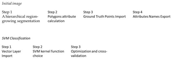 In order to create the classification, the Sentinel-2 image from 31 May 2020 (2 days after the oil leak) was used. For the purposes of this study, the supervised SVM (support vector machine) classification was selected from Geomatica Banff software (version 2018 SP2), and the object-based SVM classifier was used in Python environment []. The support vector machine classifies the data by searching for a hyperplane that maximizes the margin between classes in the training data. The algorithm is named after a relatively small number of observations, called support vectors. The classification parameters of this study are mainly useful for high resolution data []. We decided to use Geomatica Banff software as it allows us to carry out such classification on lower resolution images. The first steps in the workflow are to segment, calculate attributes, and import ground truth points for the initial image. Once that is done, the attributes fields are exported to a text file. Then, the training model is generated and SVM classification is run on that initial image. Figure 3 shows the basic workflow.