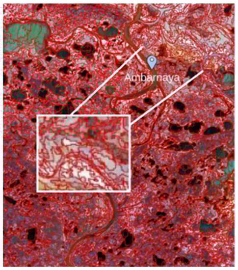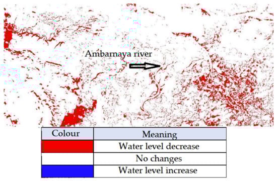 The results of surface water change detection in the area studied are alarming. The data (from Sentinel 2) taken for analysis cover the dates: 23 May 2020 (before the leak) and 10 July 2020 (after the leak). Figure 7 shows the changes that took place during this period. Red pixels indicate areas where the amount of water has decreased during this time. The white colour of the pixel means no change in the water level, and the blue pixel, which is not present on the map, would mean an increase in the water level. By analysing the image, it can be seen that the Ambarnaya River lost a lot of water during this time. This could be due to works related to area cleaning, which removes large amounts of contaminated water from the river bed. This significant decrease in water level could be linked to serious oil pollution.