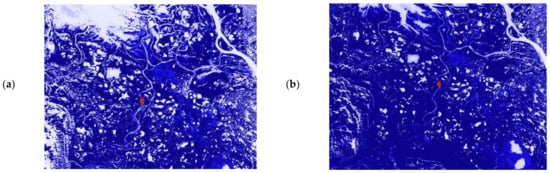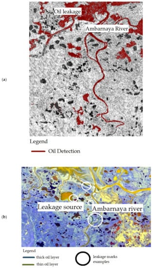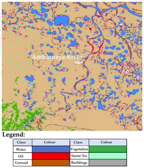 The results of mapping the oil spill with satellite images from Sentinel-1 missions are interesting (Figure 8a). The radar data have revealed more oil contamination in the area studied than by analysing Sentinel-2 images (Figure 8b). Not only is the Ambarnaya River contaminated, but also small reservoirs, basins, channels, and nearby streams. The leak detection results using Sentinel-2 data (Figure 8b) are slightly less accurate than the above-mentioned SAR methodology. However, they can visually evaluate the thickness of the oil detected. In Figure 8b, blue-colour denotes thick oil spills and green-blue spots represent thinner oil layers. Using Sentinel-1 radar data, the actual contamination state can be observed. The appropriate Sentinel-2 bands tell us about oil density and thickness. The combination of both methods gives more accurate information about the leak and allows us a better understanding of its scale.