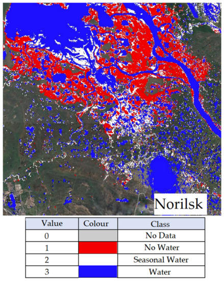The results of the analysis of water quality in the Norilsk region using the JRC Annual Water Classification History v1.3 data set are shown in Figure 9. Solid waters are blue, and the areas in which they do not exist are red. Seasonal water was marked with white pixels. The image analysis shows that water losses have increased significantly since 1984. The red pixel covers a large part of the resulting map. They are largely concentrated in the river basins, i.e., streams and channels, as well as around Lake Pyasino (upper left corner). This could mean that the toxins that were draining into the water began to accumulate around the larger reservoirs, slowly degrading the natural environment. Nevertheless, the climate has changed significantly since 1984. Siberia’s regions are warming faster, resulting in lake drying.