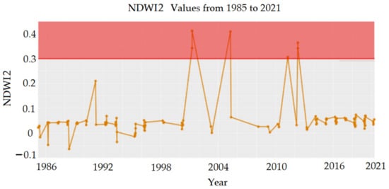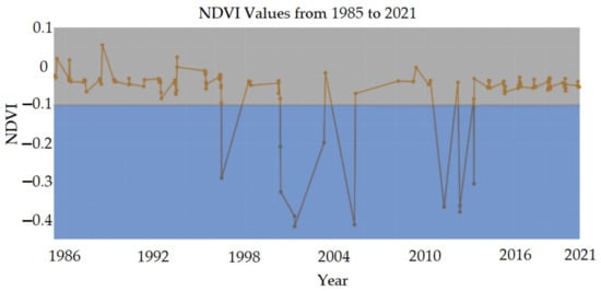 The average annual NDWI2 index from 1985 to 2021 monitors changes related to water content in water bodies over a given period (Figure 10). The results greater than or equal to the value of 0.3 are synonymous with the good water quality of the studied areas. Such results in the study area are visible only between 2001 and 2002, and in 2011 and 2013. The remaining data, obtained from 36 years of research, are below the water detectability. The average annual NDVI index from 1985 to 2021 remains in the range of values from about −0.45 to 0.05 for the analysed period of time (Figure 11). The index is based on the contrast between the near-infrared reflection and the visible red absorption. Values in the range of −0.1–0.1 correspond to barren areas, sand, or snow. Index results below this value are water, and above are vegetations. The analysis of the results shows a practical lack of healthy vegetation in the studied area. For 2020, the result fluctuates towards −0.05. This means that the test area was detected as sterile, with no clearly visible signs of healthy water, which is confirmed by the NDWI2 indicator described above.