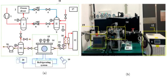 (a) The flowchart and (b) test rig of the visualized pressure adjustable frosting test, which consists of 1. compressor, 2. freeze drying equipment, 3. electropneumatic proportional valve, 4. gate valve, 5. gate valve, 6. electropneumatic proportional valve, 7. buffer tank I, 8. pressure transducer, 9. buffer tank II, 10. heat exchanger, 11. temperature sensor, 12. chiller, 13. flowmeter, 14. visualized cavity, 15. hygrometer, 16. vacuum pump, 17. atmospheric environment, 18. humid air conditioning system, and 19. data collecting system.