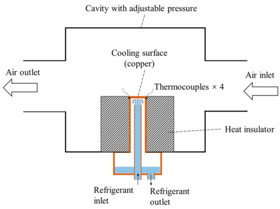 According to the theory of phase change kinetics, the phase change is related to the partial pressure of water vapor. Therefore, the partial pressure of water vapor is also used as a control variable. Furthermore, since the overall pressure of humid air is much larger than the partial pressure of water vapor, the working pressure around the cooling surface is approximated as the overall pressure in the cavity. For safety and operability reasons, the upper limit of high pressure in this experiment is set to 2.0 × 105 Pa. Within the range of working pressure around the cooling surface from 0.25 × 105 Pa to 2.0 × 105 Pa, a series of experimental frosting studies have been conducted. The temperatures of air and cooling surface and partial pressure of water vapor are adjusted to study their impacts on frost formation under different working pressures around the cooling surface. The experimental conditions are shown in Table 2.