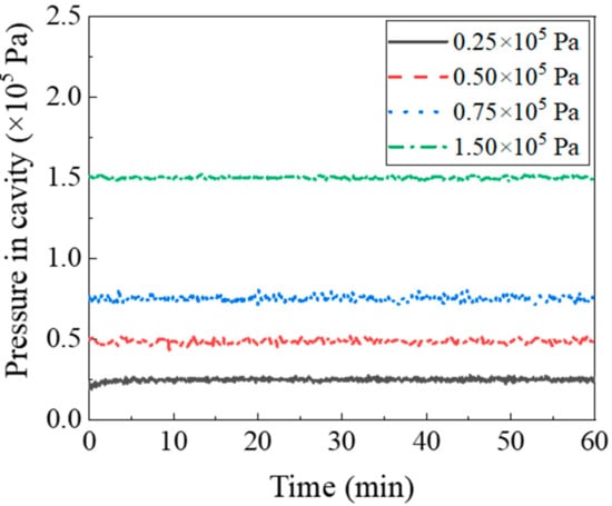 The stability of the cavity internal pressure is important to the test accuracy. For this reason, the internal pressure of the cavity during the experiment is recorded, as shown in Figure 3. The pressure in the cavity can be regarded as the working pressure around the cooling surface. The working pressure around the cooling surface is maintained by controlling the opening of the inlet and outlet valves of the cavity. The internal pressure of the cavity is maintained around the preset pressure.