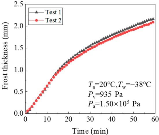 For the purpose of obtaining the conclusions with high creditability, repeated tests are carried out. The selected working condition is Ta = 20 °C, Pv = 935 Pa, Tw = −38 °C, and Pa = 1.50 × 105 Pa. The frost thickness of the two experiments is shown in Figure 4. In the initial period, there is almost no difference between the frost thickness, while it increases to 0.07 mm at 60 min. The overall deviation is 3.2%, which is within the acceptable range.