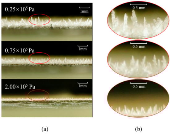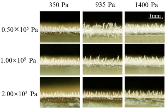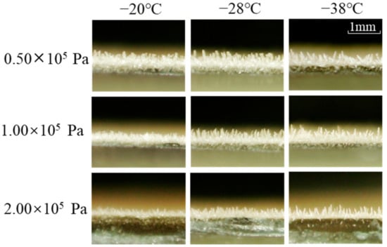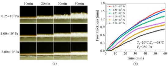 The frost crystal morphologies are photographed at 10 min, as shown in Figure 5, when Ta = 20 °C, Tw = −38 °C, Pv = 350 Pa, and Pa = 0.25 × 105 Pa, 0.75 × 105 Pa and 2.00 × 105 Pa, respectively. The frost crystal morphologies shift from feather to needle shape when the working pressure around the cooling surface increases, as shown in Figure 5b. The frost crystals at 0.25 × 105 Pa are thicker than those at higher pressure conditions. It can be attributed to the water vapor needing to cross a nucleation barrier when forming droplets or ice nuclei on cooling surfaces. Then the new frost nuclei can be created and continue to grow. The nucleation barrier is related positively to the overall air pressure, which affects the diffusion coefficient of water vapor directly []. Therefore, higher working pressure raises the nucleation barrier for forming frost nuclei, resulting in a slower growth rate of frost crystal. Moreover, the distribution of frost crystals in the lateral direction gradually becomes thinner with the increasing working pressure around the cooling surface.