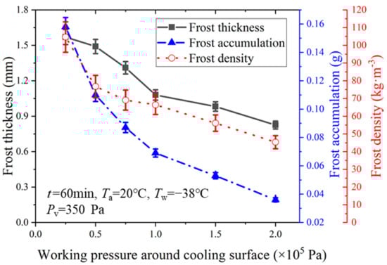 The frost accumulation and frost density with different working pressures around the cooling surface at 60 min are shown in Figure 7. The frost accumulation reduces with a higher working pressure around the cooling surface. On the one hand, it can be attributed to the diminishing diffusion coefficient of water vapor, which means that less water vapor condenses into frost crystals. On the other hand, the thermodynamic potential energy driving any crystallization process needs to exceed the change in chemical potential from one phase to another. This potential energy can be either supercooling in the case of freezing or supersaturation in the case of condensation from water vapor []. When the temperatures of air and cooling surface keep constant, the surface temperature of the frost crystal is invariant. Therefore, its corresponding saturation vapor pressure is the same. When the working pressure near the frost crystal reduces, excess concentration of water vapor leads to a larger driving potential. The phase transition rate is in direct proportion to the driving potential. Therefore, more water vapor is deposited and condensed into frost crystals, which leads to an increase in frost accumulation. In addition, the growth rate of frost accumulation declines more rapidly than frost thickness with higher pressure, and the frost density reduces with pressure, as shown in Figure 7. Under conditions where other parameters are constant, the lateral growth of frost crystals is notably promoted when the working pressure around the cooling surface lessens (from Figure 5), resulting in more narrow gaps between the frost crystals, while the growth in the vertical direction is not significant. Therefore, the reduction of density is reflected through the pressure effect on the growth habit of frost crystal.