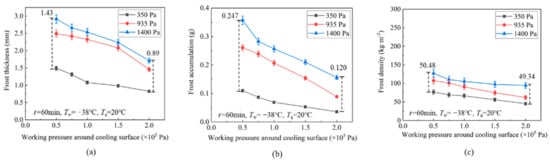 The frost thickness with working pressure around the cooling surface under different partial pressures of water vapor at 60 min is shown in Figure 9a. The frost thickness decreases with the higher working pressure around the cooling surface. In addition, the frost thickness increases with the higher partial pressures of water vapor, which can be attributed to the larger concentration difference of water vapor on the frost crystal surface. The frost accumulation and density at 60 min rise with the partial pressure of water vapor due to the enhanced driving force of mass transfer, as shown in Figure 9b,c. This rise is weakened with the higher working pressure around the cooling surface. Comparing the absolute differences of frost thickness, frost accumulation and density from low to high pressure (0.5 × 105 Pa to 2.00 × 105 Pa), they lessen from 1.43 mm to 0.89 mm, 0.247 g to 0.120 g and 50.48 kg/m3 to 49.34 kg/m3, respectively, when the partial pressure of water vapor increases from 350 Pa to 1400 Pa.