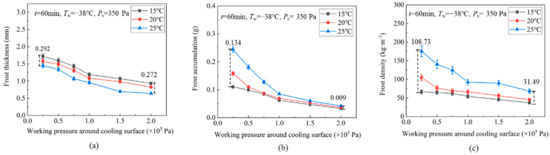 (a) Frost thickness; (b) frost accumulation; (c) frost density with working pressure around cooling surface under different temperatures of humid air at 60 min.