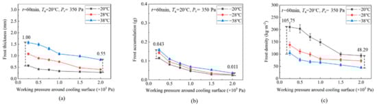 The frost thickness and frost accumulation under different temperatures of cooling surfaces at 60 min are shown in Figure 13a,b. The frost thickness and frost accumulation decrease with the higher temperature of the cooling surface. When the temperature of the cooling surface increases from −38 °C to −20 °C, the surface temperature of frost crystal rises. The heat transfer is deteriorated with the higher temperature of the cooling surface due to a smaller temperature difference. It means that fewer water vapor molecules diffuse into the surface of the frost crystal, making it more difficult to form the frost branches which create more gaps between the frost crystals. Therefore, the frost density increases with a higher temperature of the cooling surface, as shown in Figure 13c. Comparing the absolute differences of frost thickness, frost accumulation, and density from low to high pressure (0.25 × 105 Pa to 2.00 × 105 Pa), they lessen from 1.00 mm to 0.55 mm, 0.043 g to 0.011 g and 105.75 kg m−3 to 48.29 kg m−3, respectively, when the temperature of the cooling surface increases from −38 °C to −20 °C.