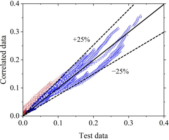 The fit of the correlated data increases with test data as frost growth in this correlation. The overall error of the dimensionless frost thickness between the correlated data and the test data is shown in Figure 14. The overall error is within ±25%. The errors in the experiment mostly come from photographing and parametric measurements. In the early frosting period, the small deviation produces a large relative error due to the small frost thickness (brown data), whereas the overall error is still within a reasonable range.