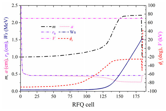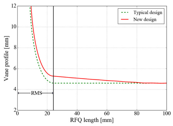 An approach is adopted to change the average aperture at the initial cells, which can reduce the difficulty of beam matching from the low energy beam transport (LEBT) into the RFQ [12,13]. In a typical RFQ design, the average aperture of the radial matching section (RMS) is reduced gradually, and the average aperture after the RMS remains constant, as shown in Figure 1. While in the new design, the average aperture after the RMS is larger than that of the typical design.