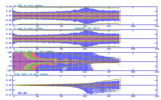 Evolution of beam envelopes along the RFQ cell from PARMTEQM. Plots from top to bottom are the beam profiles in the x and y planes and phase and energy spectrums, respectively.