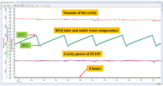 As a result of our investigation, we found that this 99.9% oxygen-free copper has the problem of hydrogen adsorption [15]. The most effective way to degas hydrogen on the metal surface is to anneal the metal. Fiberglass heating belts were used to heat the RFQ cavity. Additionally, we also increased the inlet temperature of the RFQ cooling water from 16 °C to 20 °C. During the consecutive seven days, the cavity vacuum slowly improved with RF conditioning at a power of 55 kW. In addition, the reflected signal on the scope was stable and there was almost no spark in the cavity. The log of a 6-h long operation at 55 kW is shown in Figure 7. The cavity power trace was almost constant and the cavity vacuum trace was slow to fall during that time.