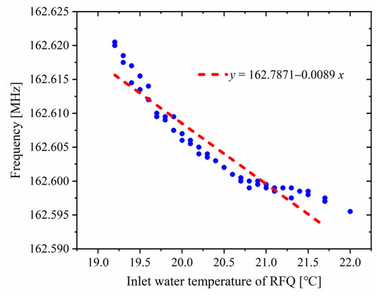 Another problem encountered during RF conditioning came from the cooling system of the RFQ. The inlet water temperature of the cooling water cannot be maintained at a certain value, and the inlet water temperature difference reached 3 °C, as shown in Figure 7 (blue trace). Since the RFQ operates at a 1% duty cycle, the heat loss caused by RF power is relatively small. During RF conditioning with a power of 55 kW, we recorded the resonant frequency of the cavity under different cooling water temperatures. The influence of the inlet water temperature on the frequency of the cavity is shown in Figure 8. A new cooling system will be introduced into the RFQ in the future to reduce frequency instability during high-power operations.