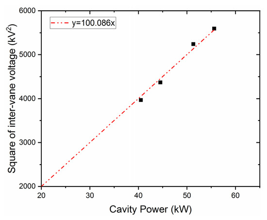 We measured the inter-vane voltage under different cavity powers, as shown in Figure 12. The specific shunt impedance of the RFQ can be deduced from the slope of the linear fitting line ( from Figure 12). The specific shunt impedance is 221 kΩ·m, which is 92% of the simulated value. According to the calculated specific shunt impedance, an inter-vane voltage of 70 kV can be achieved at a cavity power of 48.6 kW.