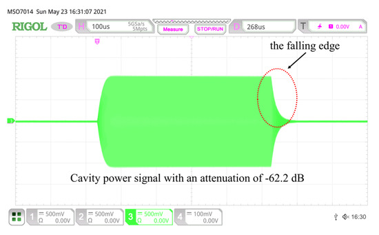 The coupling factor that we measured by the network analyzer is , which is −62.2 dB. In the case of neglecting coaxial cable line loss, the dependence of the cavity power on the scope amplitude is given by: