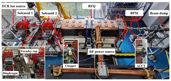 The experimental setup for beam commissioning of the RFQ is shown in Figure 15. It consists of a 2.45 GHz electron cyclotron resonance (ECR) ion source, a LEBT system, the RFQ, and a medium energy beam transport (MEBT) section. The LEBT has two solenoids (Solenoid 1 and Solenoid 2) to transport the beam and match it into the RFQ. A pair of steerers (horizontal and vertical) is installed in the middle of each respective solenoid. In order to characterize the beam extracted from the ion source, the diagnostics chamber equipped with a water-cooled diaphragm and faraday cup (FC) is installed between the two solenoids. The water-cooled diaphragm is used to control the intensity and emittance of the beam. The bias voltage of FC is set to −300 V to suppress the secondary electrons (SE). Between the Solenoid 2 and the RFQ, there is a chopper used to control the time structure of the pulse beam, while playing the role of fast protection of the machine. Two beam position monitors (BPMs) are installed after the AC current transformer (ACCT) for beam energy measurement. The extraction voltage of the ion source is fixed at 40 kV to provide the design injection energy of 40 keV for the 2H+ beam. The low-level RF (LLRF) control is used to synchronize with the timing system of the whole accelerator.