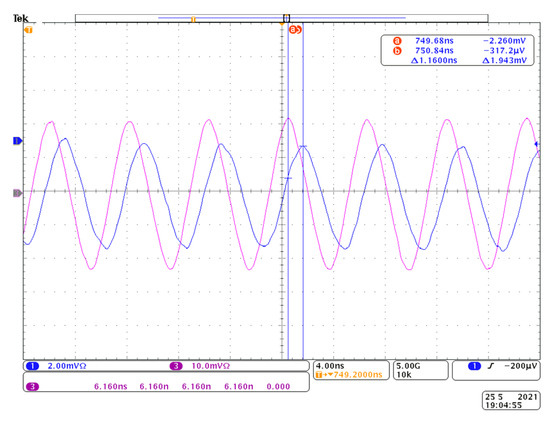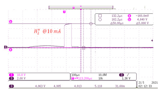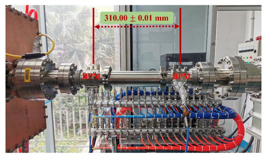 The beam energy was determined by time-of-flight (TOF) using the scope traces from the two BPMs. The TOF principle can be found in [20]. Figure 17 shows the distance between the two BPMs, and Figure 18 shows the corresponding time signals for 2H+ beam. The flight time of the beam over the distance of 310 mm is , the measured relative time is 1.16 ns, the integer number n of RF periods is equal to 4 and RF period T is 6.16 ns. Therefore, the calculated flight time is 25.80 ns. The velocity and energy of the particles are given by Equations (11) and (12). The error in the energy measurement comes from the measurement of the distance, the cable length, and the resolution of the scope. The distance error is ±0.1 mm, and the measurement tolerance of the timing system is ±200 ps. According to the error transfer formula Equation (13), the energy measurement error of 2H+ is ±0.024 MeV. We made multiple measurements, and the average output energy of 2H+ is 1.579 ± 0.024 MeV. The beam energy measured by the TOF method agrees well with the designed value.
