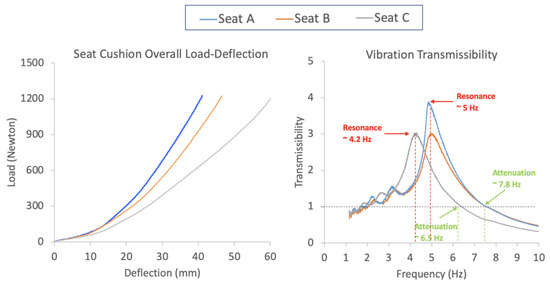 Overall hardness measured by load-deflection curves (left) and vibration transmissibility (right) of three testing seats per SAE J2896.