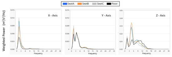 The PSD analyses indicated all seats amplified low to mid frequency energy in all three axes for all road segments. The Z-axis was the dominant axis for vibration exposure. As a representative example, Figure 6 shows the weighted PSD curves on the X,Y, and Z axes from the city street segment. The results showed that all the three seats attenuated the Z-axis vibration energy above 9 Hz, as indicated by all three seat lines being below the black line (floor). While all the three seats amplified the Z-axis vibration energy between 2.5 and 8.5 Hz, Seat C attenuated Z-axis vibration energy above 6 Hz more so than the other two seats.