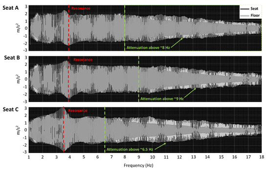 In addition, as shown in Figure 8, all seats amplified the low frequency X-axis vibration(1–3 Hz) and attenuated the intermediate frequency vibration (3–15 Hz). For the Y-axis vibration, all seats amplified the vibration over the whole frequency range with Seat B amplifying the Y-axis vibration more than Seats A and Seat C.