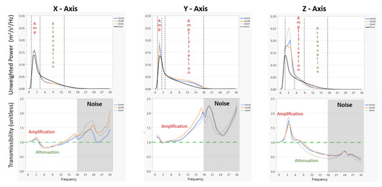 Unweighted power spectral densities for the x-, y- and z-axes (top) and Transmissibility (bottom) (n = 10).