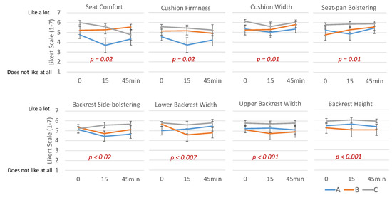 The dynamic seating comfort rating data showed that all the three seats were rated as relatively comfortable (ratings > 4 in the 1–7 scale) as shown in Figure 9. Seat C was consistently and significantly rated higher for the eight criteria compared to Seat A and Seat B (Figure 9).