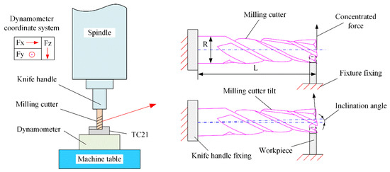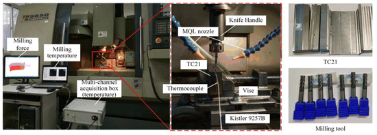The experimental system for milling machining is shown in Figure 1. The experimental system includes the force measuring system, the temperature measuring system, the MQL system, the machine tool, the workpiece, and the milling cutter. The model of the machine tool is a TH5650 vertical machining center. The spindle of the machine tool is controlled by an encoder, which can realize infinitely adjustable speed. The maximum speed of the main motion can reach 6000 r/min. The rapid feed of the x-axis and y-axis can reach 24 m/min and the z-axis can reach 15 m/min. The force measuring system mainly includes the Kistler 9257B force measuring instrument, the Kistler 5070 charge signal amplifier, the data acquisition card, and the signal analysis software. The measuring accuracy is 0.01 N, and the data acquisition frequency is 4 kHz. The temperature measuring system includes the k-type thermocouple, the multichannel acquisition box, the signal amplifier, and the display devices. The data acquisition frequency of milling temperature is 20 kHz.