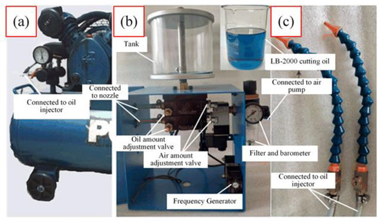 The MQL system is shown in Figure 2. The MQL system includes the air pump, the air pressure gauge, the oil tank, the air and oil amount adjustment valves, the frequency generator, and the nozzle. Accu-Lube precision oil spraying device is used for the MQL system. The lubricant used for MQL is Accu-Lube LB-2000 super-lubricated spray-type vegetable cutting oil. The viscosity of cutting oil is 36cSt at 40 °C. The strength of the oil film is 60 kg/cm2.