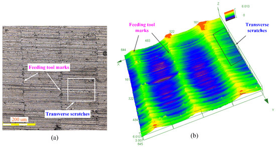 Feeding tool marks and surface scratches: (a) two-dimensional topography; (b) three-dimensional topography.