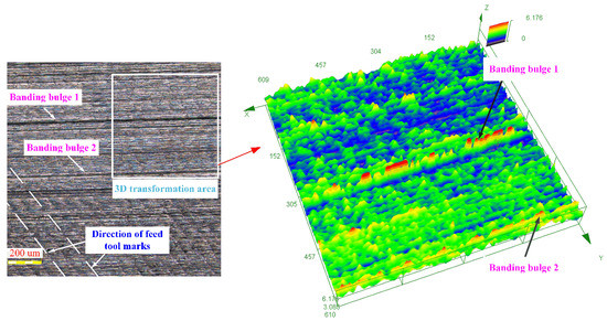 The inspection of the machined workpiece revealed that the banding bulges could be easily observed on the workpiece surface side milled by high-pressure air cooling and dry milling (see Figure 5). For the formation of the banding bulges, the high-pressure air cooling and dry milling have higher temperatures compared with MQL machining. The workpiece material tends to bond on the tool surface during machining and form a chip tumor to complete cutting. The chip tumor squeezes the workpiece material and causes plastic flow during the machining process. The banding bulges are formed at the cutting edge of the chip tumor. In addition, the local temperature distribution is not uniform in the cutting area. For the same force, the material in the high-temperature area is more prone to flow to the low-temperature area, forming the banding bulges.