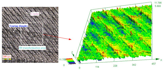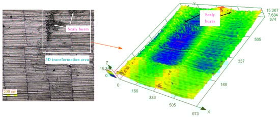 During the machining process, some scaly burrs are found on the milled surface of titanium alloy TC21 (see Figure 6). From the height-color scale, the 3D image shows that the burrs have a certain height. Thus, the existence of burrs increases the roughness of the milled surface and deteriorates the surface quality. For the formation of scaly burrs, it may be since some large particles are introduced into the area between the machined surface and the tool flank. Under the squeezing effect, the particles form craters and scratches on the machined surface. The large particles may be produced in two forms; one is the shedding of the tool surface bonding, and the other is the deposition of debris.