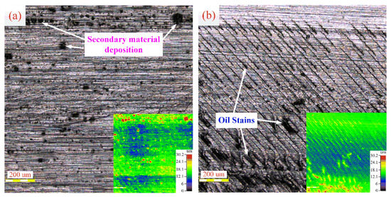 During the high-pressure air cooling and dry milling process, black scars can be easily observed on the machined surface (see Figure 8). Especially, the most scars are observed on the dry milling surfaces and these substances cannot be rinsed off by alcohol after machining. The black scars may be caused by the high temperature in the dry milling and high-pressure air cooling cutting area, which easily oxidizes some elements in the titanium alloy material or tool. The secondary oxides are deposited on the original titanium alloy surface, forming black scars. If the flushing is not timely after machining or there are deep cracks on the machined surface, large black oil stains are easily deposited on the surface. In Figure 8, both the secondary material and the oil deposited areas are shown as yellow scars. From the height-color scale, this indicates that the height of these deposited areas is greater than other areas. Therefore, both secondary material deposition and oil stains affect the surface roughness of milled titanium alloy TC21 and reduce the surface quality.