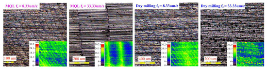 Figure 12 shows the surface topography of the machined workpiece at different feeds per tooth. When the feed per tooth is 8.33 μm/z, the height distribution of the surface is uniform for both dry milling and MQL conditions, but there are slight banding bulges on the surface. The banding bulges under MQL condition are caused by the feeding tool marks, while the banding bulges on the machined surface are raised due to high-temperature plastic deformation under dry milling condition. When the feed per tooth is increased to 33.33 μm/z, the feeding tool marks under MQL condition become apparent and the height of the residual material in the feeding tool marks increased significantly. In contrast, although little feeding tool marks are observed for the dry milling condition, a large amount of secondary material deposition appears.