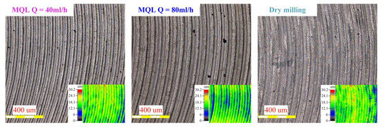 MQL is a green machining method that uses the high-pressure oil mist to cool and lubricate the machining area. The number and position settings of the high-pressure oil mist nozzles, air pressure, and lubrication amount used all affect the lubrication effect of MQL. Figure 13 shows the surface topography of the machined workpiece at different lubrication amounts. According to Figure 13, it can be seen that under MQL machining condition, when the lubrication amount is 40 mL/h, the feeding tool marks are more obvious compared to dry milling. Compared with the lubrication amount of 80 mL/h, there are more banding bulges on the bottom surface of slot milling, which is caused by plastic deformation. Thus, when the lubrication amount is 40 mL/h, it cannot improve the plastic deformation of the workpiece surface caused by the extrusion of cutting heat and tool flank. The cooling effect from the high-pressure oil mist makes feeding tool marks more obvious.
