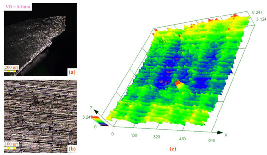 The surface topography of the machined workpiece, (a) tool wear, (b) two-dimensional topography, and (c) three-dimensional topography.