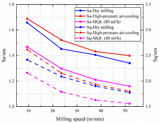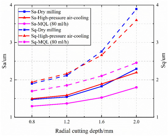 Figure 15 and Figure 16 show the effects of milling speed and radial cutting depth on the surface roughness Sa and Sq, respectively. As the milling speed increases, the surface roughness slowly decreases. With the increase of radial cutting depth, the surface roughness under dry milling condition increases rapidly. MQL can effectively suppress the generation of secondary material deposition. Thus, the surface roughness changes more slowly with radial cutting depth under the MQL condition compared with the dry milling condition.