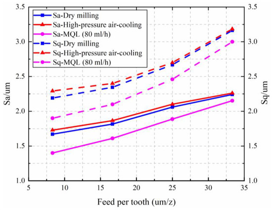 Figure 18 shows the effect of feed per tooth on the surface roughness Sa and Sq. With the increase of feed per tooth, the machining quality of the milled surface becomes worse and the surface roughness increases. Banding bulges and secondary material deposition are the causes of increased roughness of the milled surface under dry milling and high-pressure air cooling conditions. In contrast, the residual feeding tool mark is the primary factor affecting the surface roughness under the MQL condition. From the experiments, the radial cutting depth affects the surface roughness significantly under high-pressure air cooling and dry milling conditions. It is the axial cutting depth that has the least effect on surface roughness in all three environments. Since the lubrication and cooling effect of high-pressure oil mist can reduce the scraping between the milling cutter and workpiece, MQL can effectively suppress the plastic deformation of the workpiece surface. Although the feeding tool marks are obvious, the surface roughness is still significantly reduced and the machined surface quality is improved.