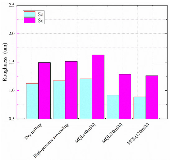 By the effects of the lubrication parameters on the microscopic topography of the milled surface in the previous section, it can be seen that MQL does not always improve the surface quality. When the lubrication amount is low, MQL may deteriorate the surface quality of the workpiece. Figure 19 shows the trend of the surface roughness with the lubrication parameters. As can be seen from Figure 19, when the lubrication amount of MQL is 40 mL/h, the roughness of the milled surface is the largest. This is because the low lubrication amount does not effectively suppress the plastic deformation of the titanium alloy and makes the feeding tool mark more obvious. When the lubrication amount of MQL increases to 80 mL/h, the roughness of the milled surface decreases rapidly. At this time, a stable lubricant film is formed between the milling cutter and workpiece, which can reduce the scraping effect and inhibit the plastic deformation of the workpiece surface. When the lubrication amount increases to 120 mL/h, the roughness Sa and Sq change hardly. It indicates that when the lubrication amount reaches a certain value, continuing to increase the lubrication amount has a limited effect on the surface roughness of the workpiece.